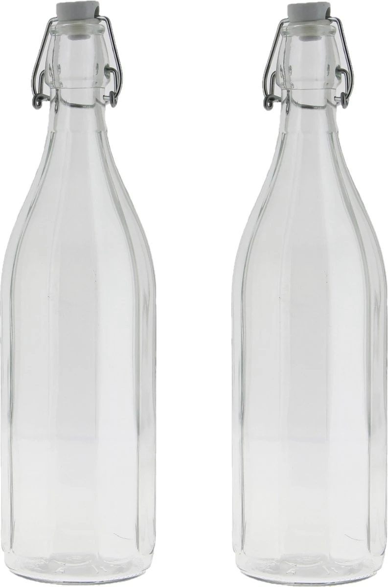 2x Stuks glazen fles transparant 1000 ml met een stevige en luchtdichte beugeldop. De fles is niet alleen geschikt voor het serveren/bewaren van alle soorten koude dranken, zoals water, sappen en/of wijn maar ook om in uw keuken te gebruiken voor olie/azijn of ter decoratie (met bijvoorbeeld een bloem) neer te zetten in uw huis! Afmeting: ca. 8,5 x 30,5 cm. Inhoud: ca. 1 liter, 1000 ml. Materiaal: glas. Reinigen: hand afwas.