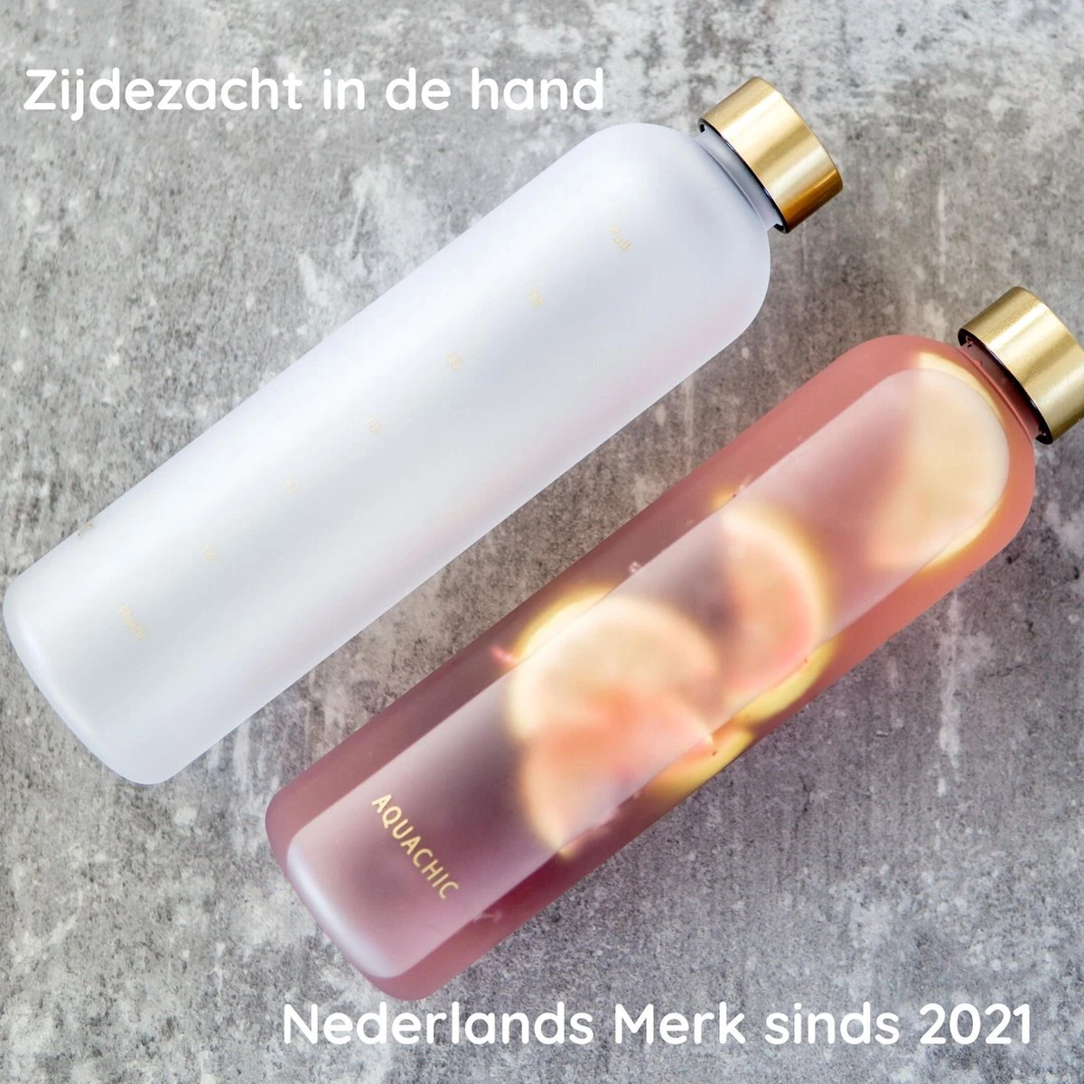 Stay hydrated in style en combineer de fles met jouw twee doppen! De fles komt standaard met gouden dop en extra zilveren dop. Ons doel is om water drinken makkelijker en leuker te maken. Wij zijn Aquachic, een startend bedrijf uit Nederland. Onze missie is Nederland meer te laten drinken, op een leuke manier. De handige tijdsmarkeringen aan de zijkant van de fles herinneren je om water te drinken. Het leuke van de witte fles is dat het semi transparant is, dus vul je de fles met water en bosvruchten, dan krijg je een mooie roze kleur. Hergebruik de Aquachic fles en verbeter zo jouw ecologische voetprint. Bijvoorbeeld op het werk of school, op reis, tijdens het sporten en natuurlijk lekker comfy thuis. De fles is trouwens ook goed bestemd tegen krassen, ideaal voor on the go of bijvoorbeeld in je tas!