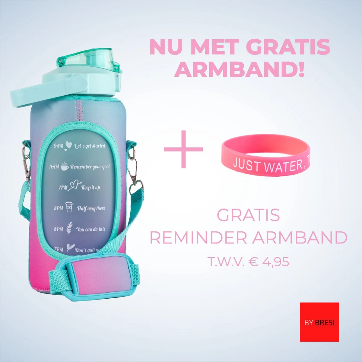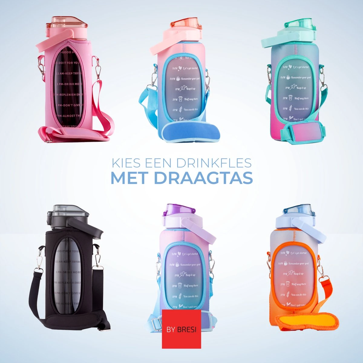 Onze 2 liter drinkfles met bijpassende sleeve en motivatie armband! Neem je drinken nu nog makkelijker overal mee naar toe samen met je allerbelangrijkste items.