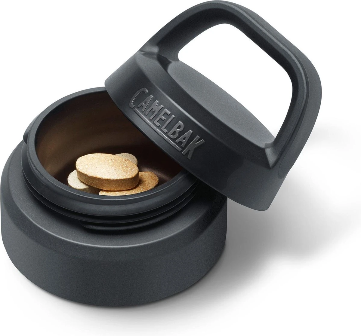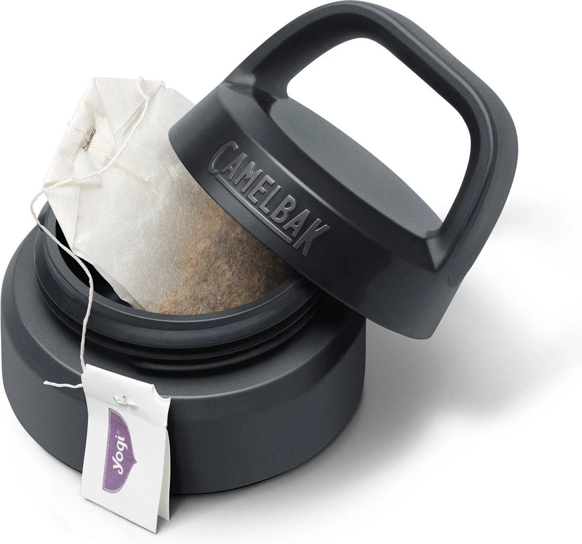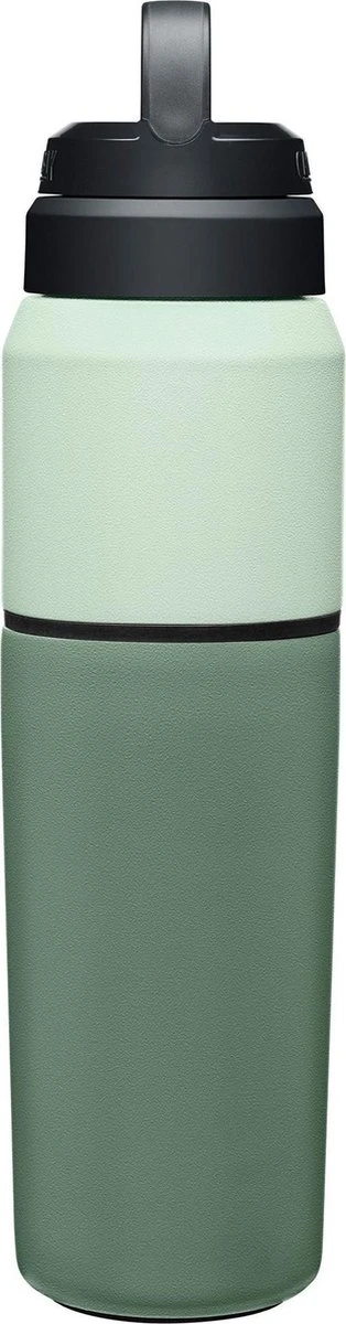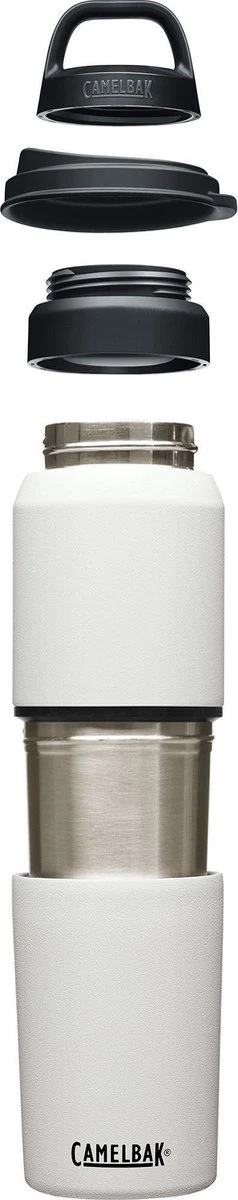 De CamelBak MultiBev is een waterfles met een afneembare reisbeker voor een kopje koffie, thee of gewoon om uit te delen. Dubbelwandig RVS houdt de warme dranken urenlang warm en de koude dranken urenlang lekker fris. De dop is dankzij de siliconen deksel lekvrij. De onderdelen zijn eenvoudig uit elkaar te halen en zijn stuk voor stuk vaatwasserbestendig. Afbeelding vier is ter illustratie.