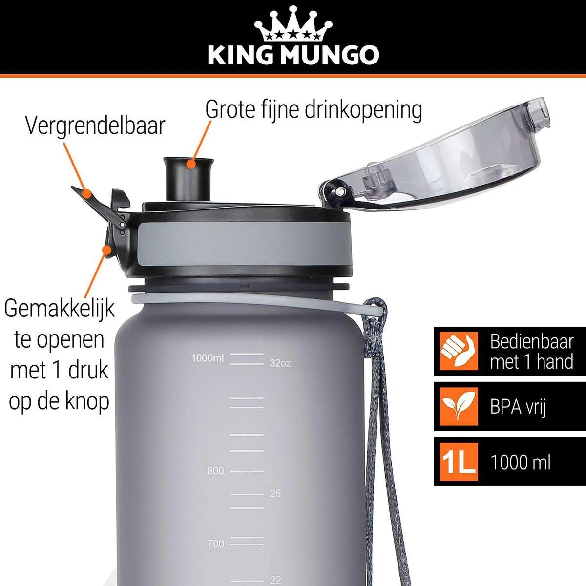 Hoge kwaliteit drinkfles 1 liter, lekvrij en zeer comfortabele grote 1 liter drinkfles / bidon / drinkbus voor dagelijks gebruik of als sportfles van hard Tritan plastic. Met unieke lekvrije dop die met 1 hand snel te openen is. Een uniek sluitmechanisme, vergrendel de dop zodat de grote waterfles niet lekt in je tas. Deze herbruikbare en dus duurzame grijze King Mungo 1000 ml design waterflessen zijn BPA vrij (veilig en geen plastic smaak aan het water).