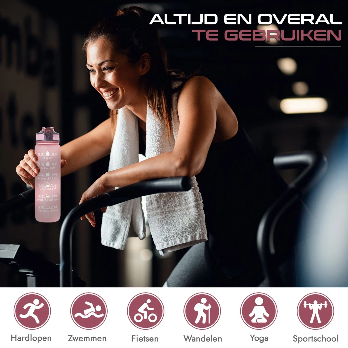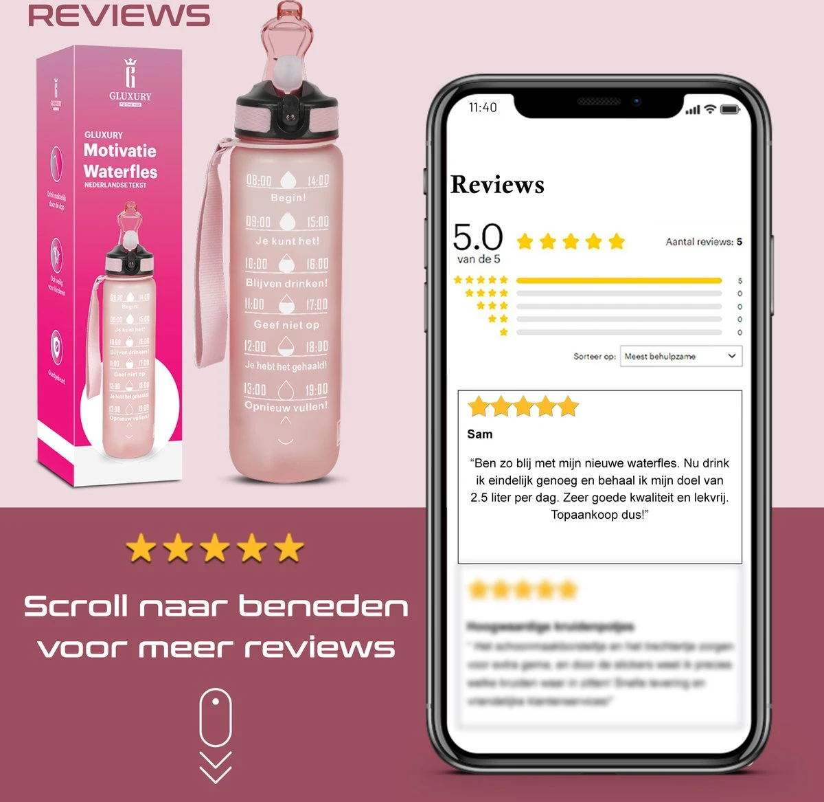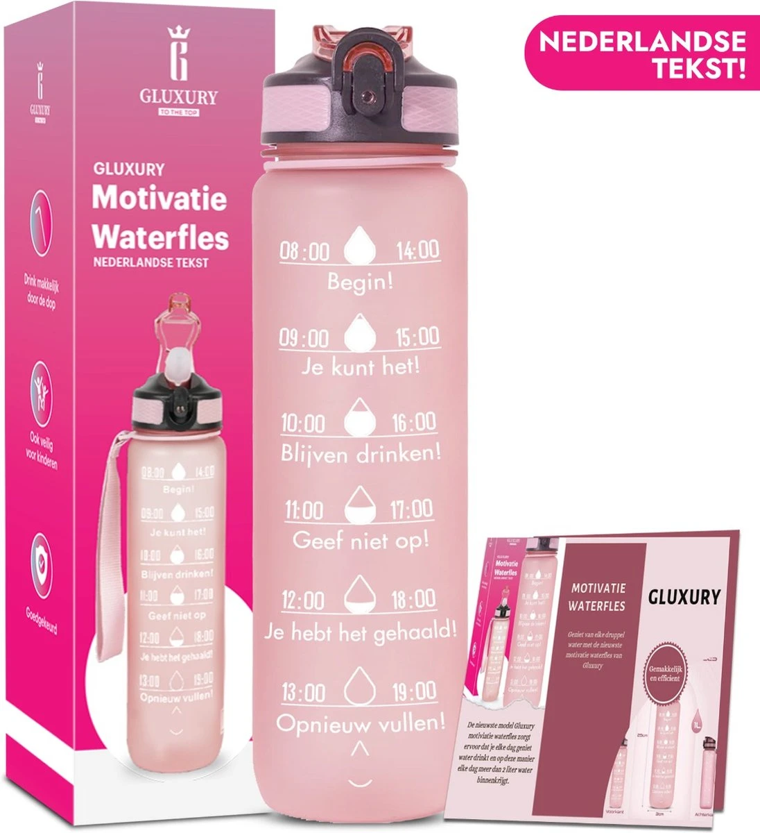 eb je weleens de neiging om minder water te drinken dan gezond voor je is? Met het nieuwste model motivatie waterfles van Gluxury heb je hier geen last meer van. Door de extra motivatie die op de fles staat drink je gedurende de dag veel meer water. De tekst is in het Nederlands en motiveert je dus nog meer dan de andere flessen in het Engels. Zo kan je je doel van 2 liter water makkelijk en met veel plezier halen.