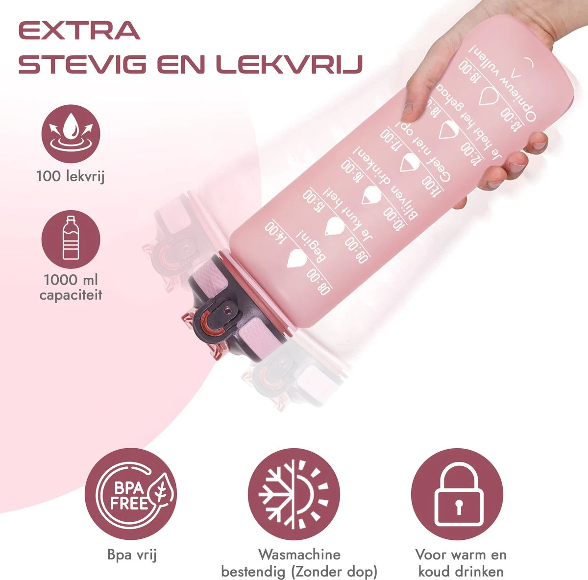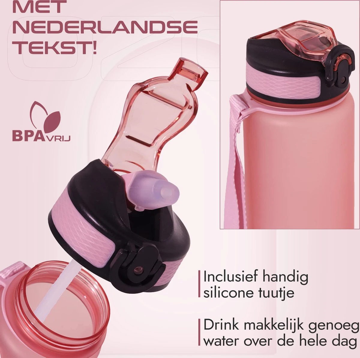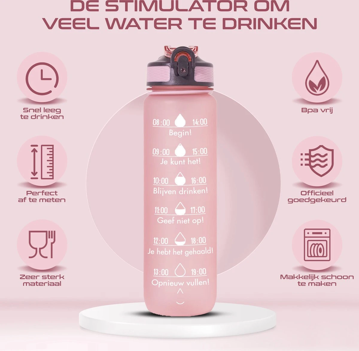 De fles heeft Nederlandse tekst, dit geeft extra motivatie om veel te drinken. De tekst is speciaal gemaakt om hem minimaal 2 of 3 keer per dag leeg te drinken. Hoe verder je komt hoe meer motivatie je krijgt. Kortom, een echte motivator.