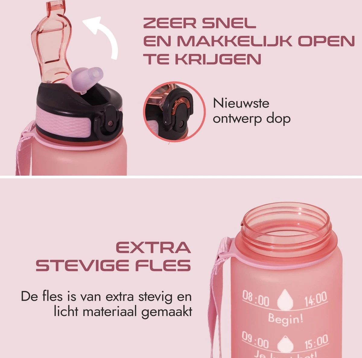 De waterfles is extra makkelijk in gebruik omdat er een handige knop op zit om te fles open te doen. Zo hoef je niet veel moeite te doen om een slok water te nemen en stimuleert dit extra om te drinken. Daarnaast is de fles 360 graden lekvrij en extra stevig. Er kan dus flink gesport worden met de waterfles. De fles is voorzien van 1 liter reservoir, zo kan je extra veel water meenemen.