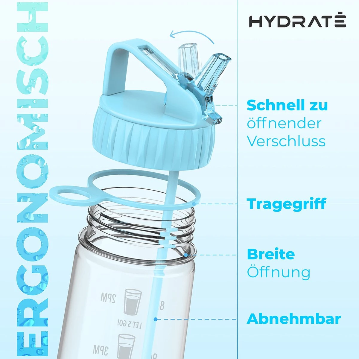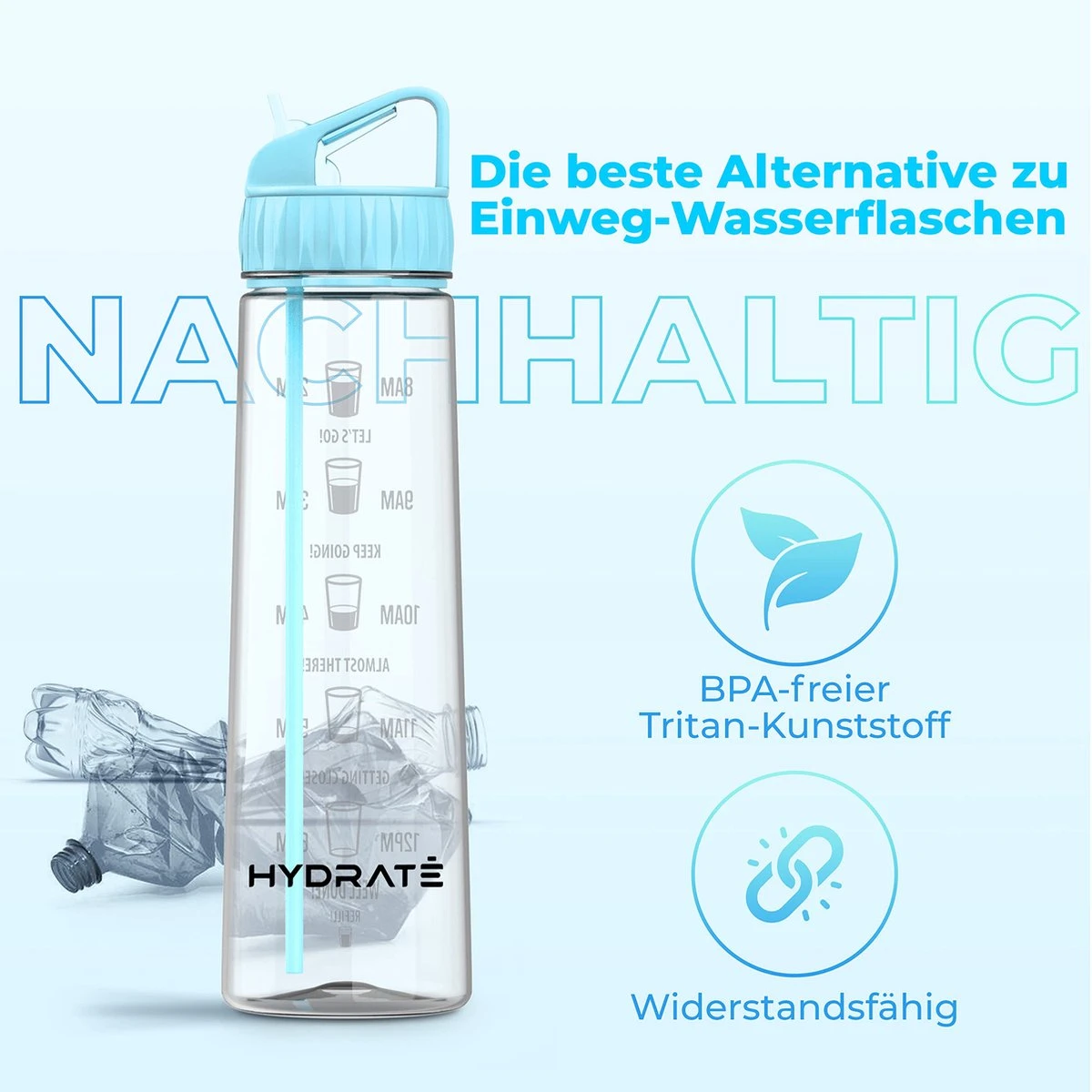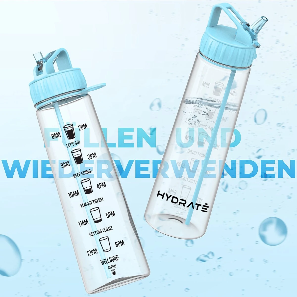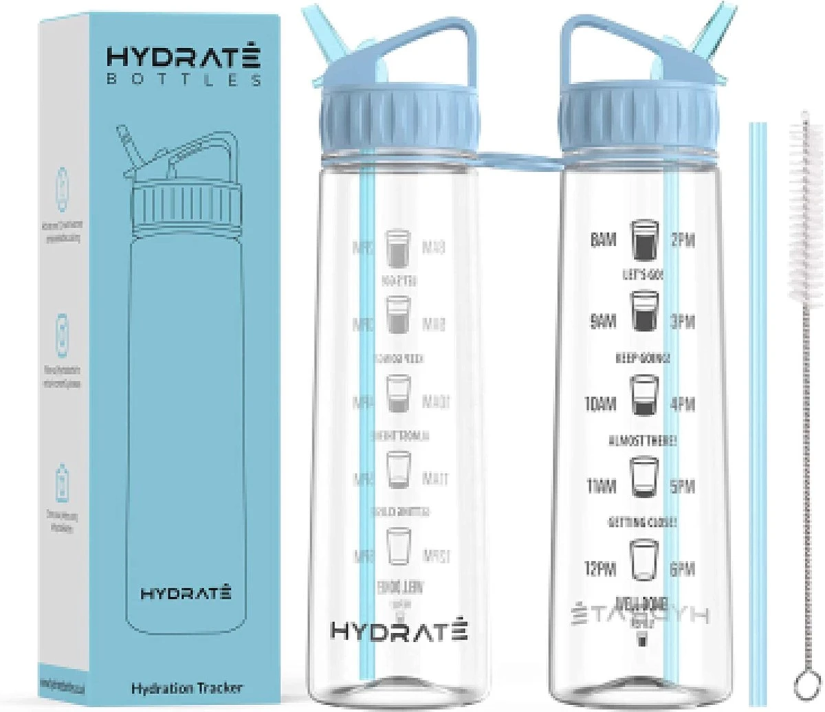HYDRATE 900ml Drinkfles Met Tijdmarkeringen – Sport Waterfles Met Rietje, BPA-vrije Drinkfles Rietje Van Tritan Ideaal Voor Sportschool, Kantoor, Wandelen, Fitness, Sportfles (Hemelsblauw)