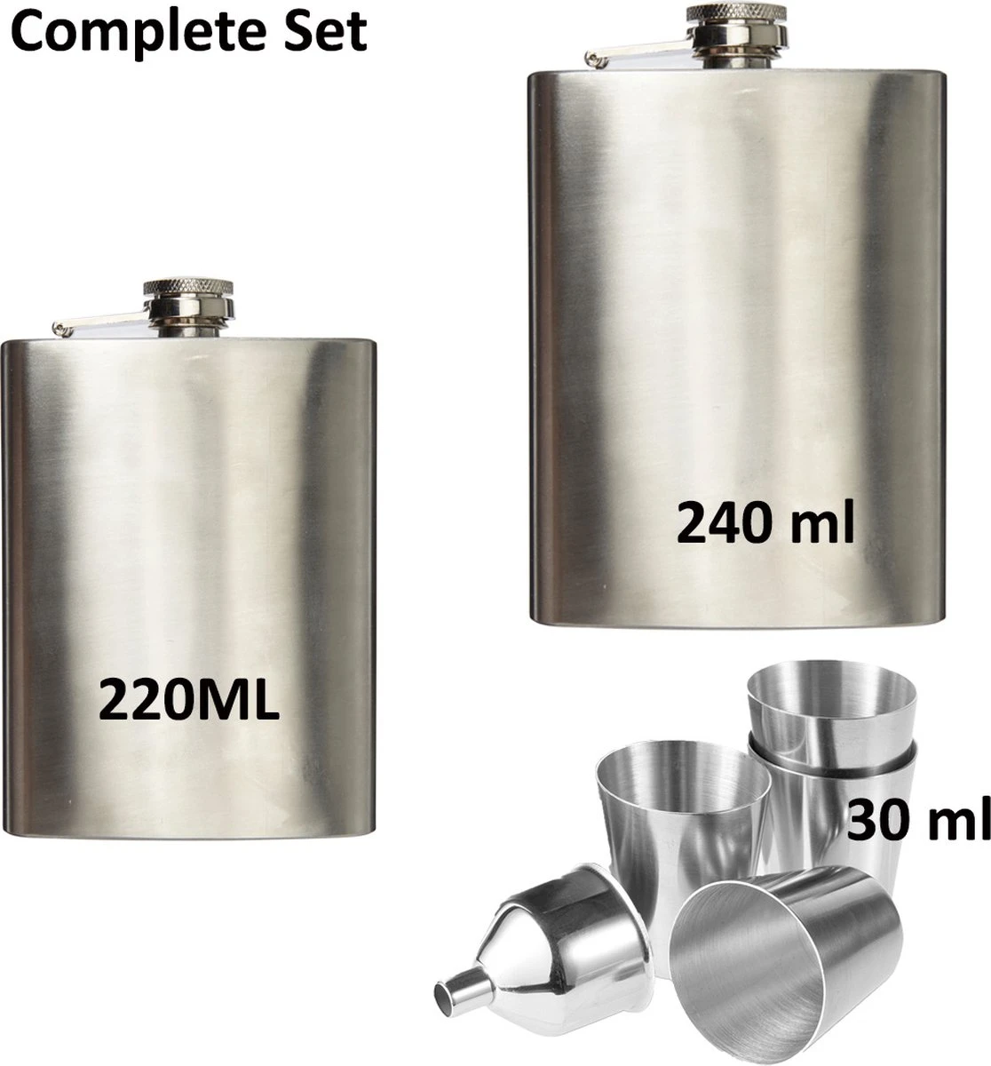 2x Heupflessen 240 en 220 ml en 4 Bekers en 1x Trechter
