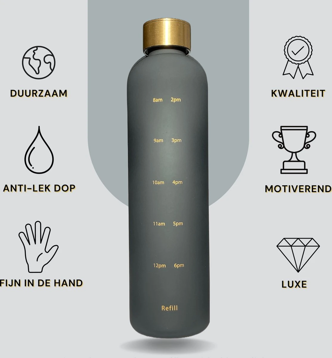 Kijk jij uit naar een gezonde levensstijl, maar lukt het nog niet om genoeg water te drinken? Dan is de motiverende waterfles van 2Refill precies wat jij nodig hebt! Deze luxe fles zorgt er doormiddel van tijdsmarkeringen voor dat jij nooit meer vergeet genoeg water te drinken. Loop niet alleen rond met een prachtige fles maar ervaar ook de vele lichamelijke voordelen zoals meer energie, meer gewichtsverlies en minder hoofdpijn.