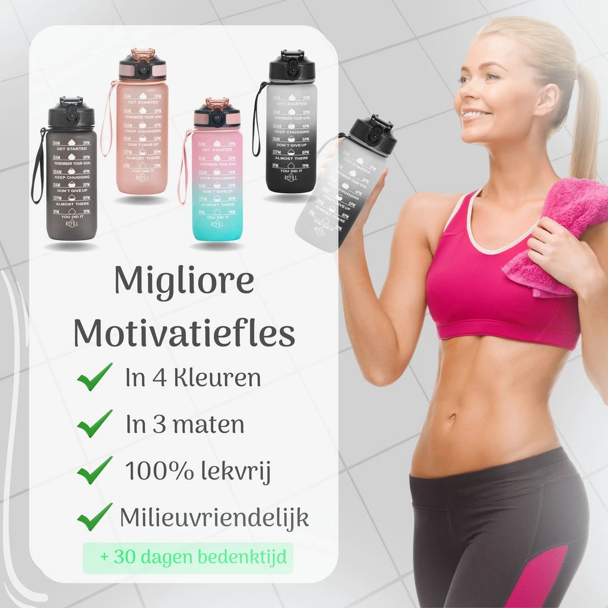 Houd jouw vochtinname en gezondheid in balans! Wacht niet langer en bestel vandaag nog jouw luxe drinkfles, nu besteld is de volgende dag in huis!
