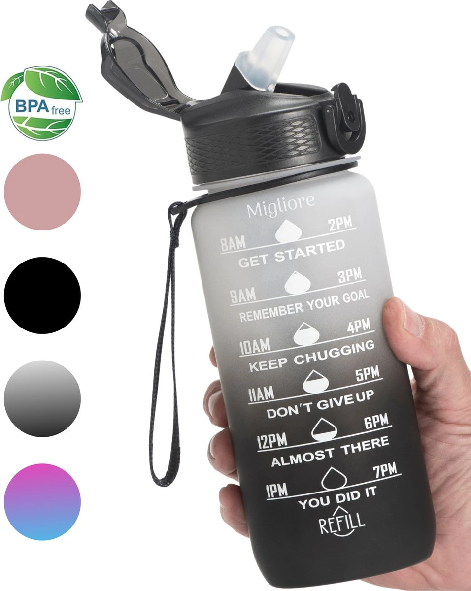 Drink elke dag genoeg water met de Migliore Drinkfles. Inclusief afneembaar Rietje. Het Rietje heeft een zeer snelle waterstroom en is ook gemakkelijk schoon te maken in de vaatwasser. Met de inspirerende quotes wordt je dagelijks gemotiveerd genoeg water te drinken. De Fles is gemakkelijk mee te nemen en ideaal voor in de sportschool, andere sport activiteiten en ook thuis en op kantoor. Met een inhoud van 600 ml hoef je de fles maar 2 keer bij te vullen zodat u gemakkelijk aan 2 liter water per dag komt. Blijf gehydrateerd, blijf gezond!!