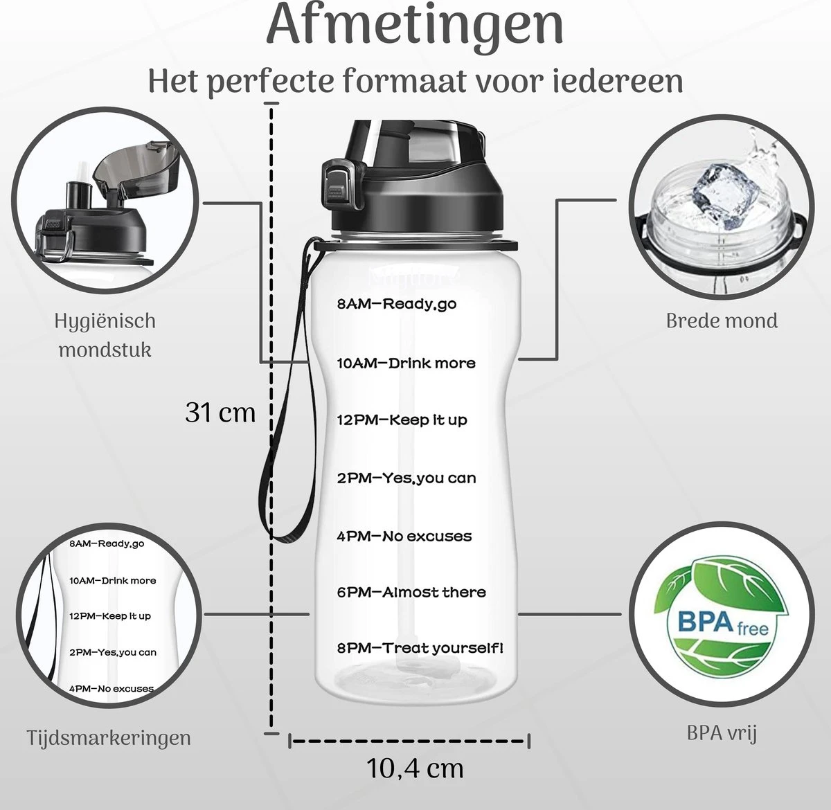 De fles is voorzien van enkele motiverende teksten om jou dat extra zetje in de rug te geven! Vul de fles elke dag, zodat je weet dat jij voldoende water hebt binnengekregen.
