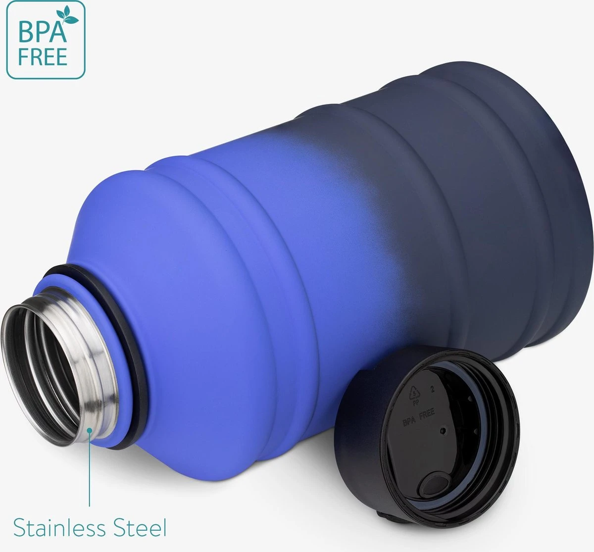 - XL: De drinkfles heeft maar liefst een inhoud van 2,2 liter. Zo heb je altijd genoeg water bij de hand tijdens een intensieve training. Handig in de sportschool tijdens een lesje yoga, pilates, bobybuilding of CrossFit.