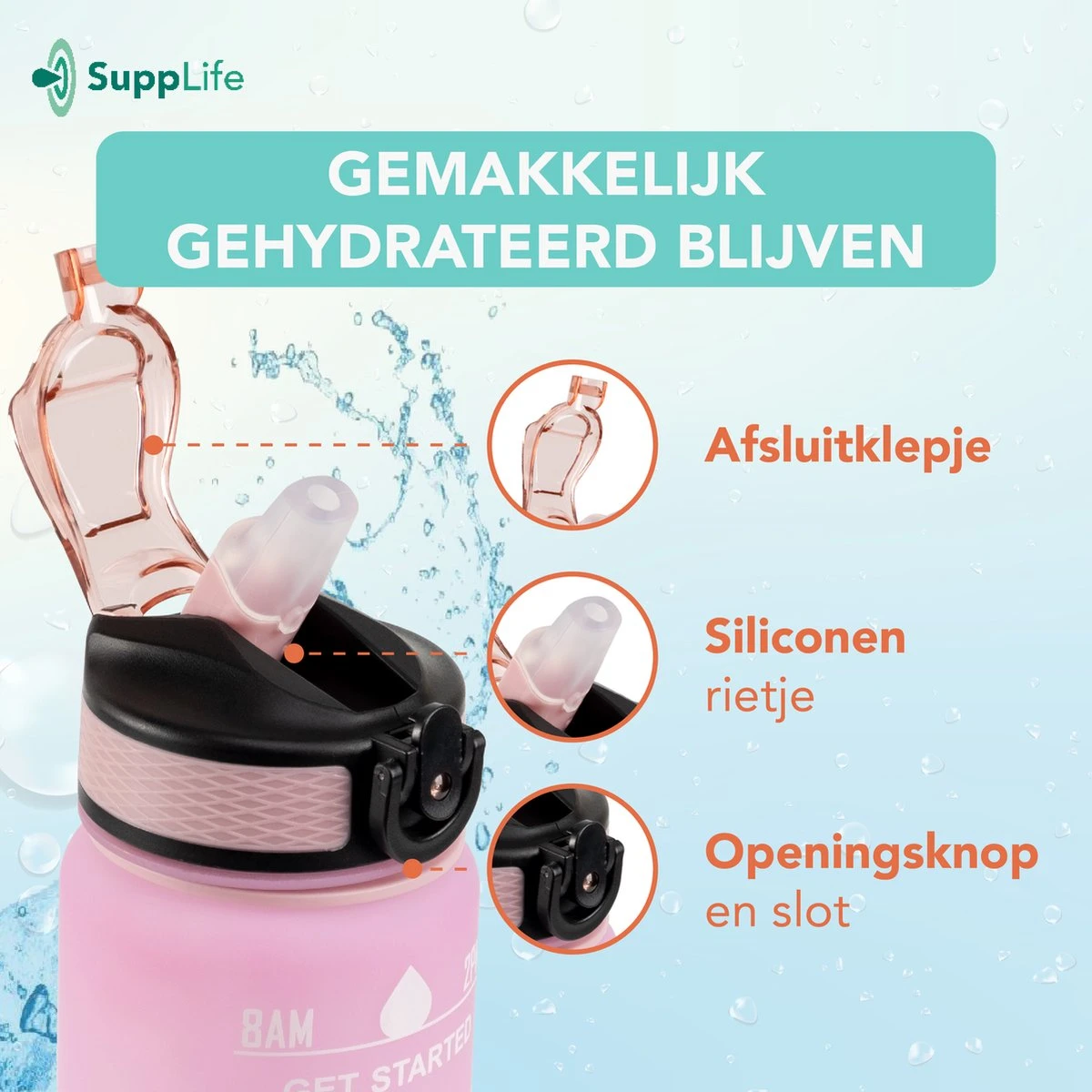 Drink jij wel genoeg water? Met de Supplife Waterfles vergeet jij nooit meer water te drinken. Op de drinkfles staan tijd markeringen en motivatie quotes die jou helpen herinneren water te blijven drinken. Zodat jij iedere dag 2 liter water binnen krijgt. Deze veldfles bevat in totaal 1 liter water en hoeft in principe dus maar 1x per dag bijgevuld te worden.