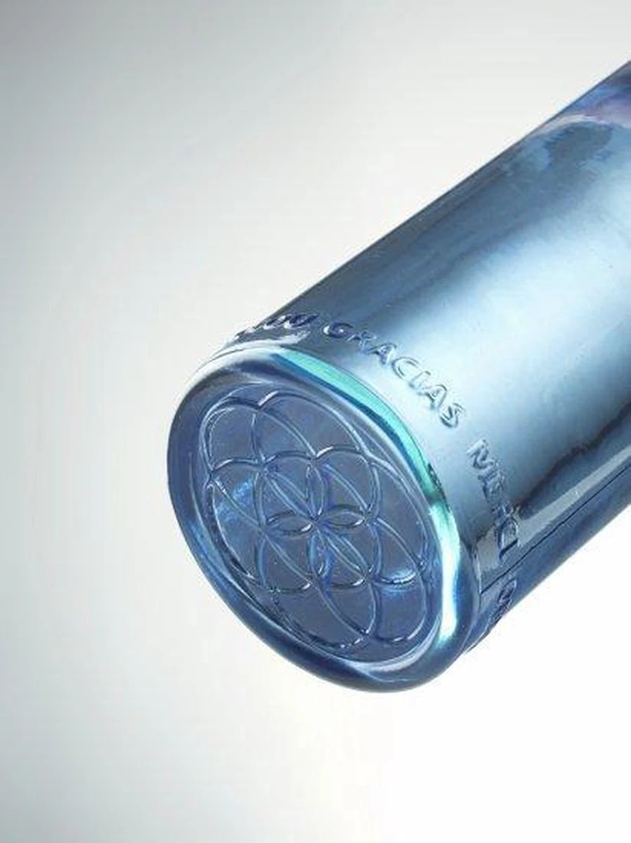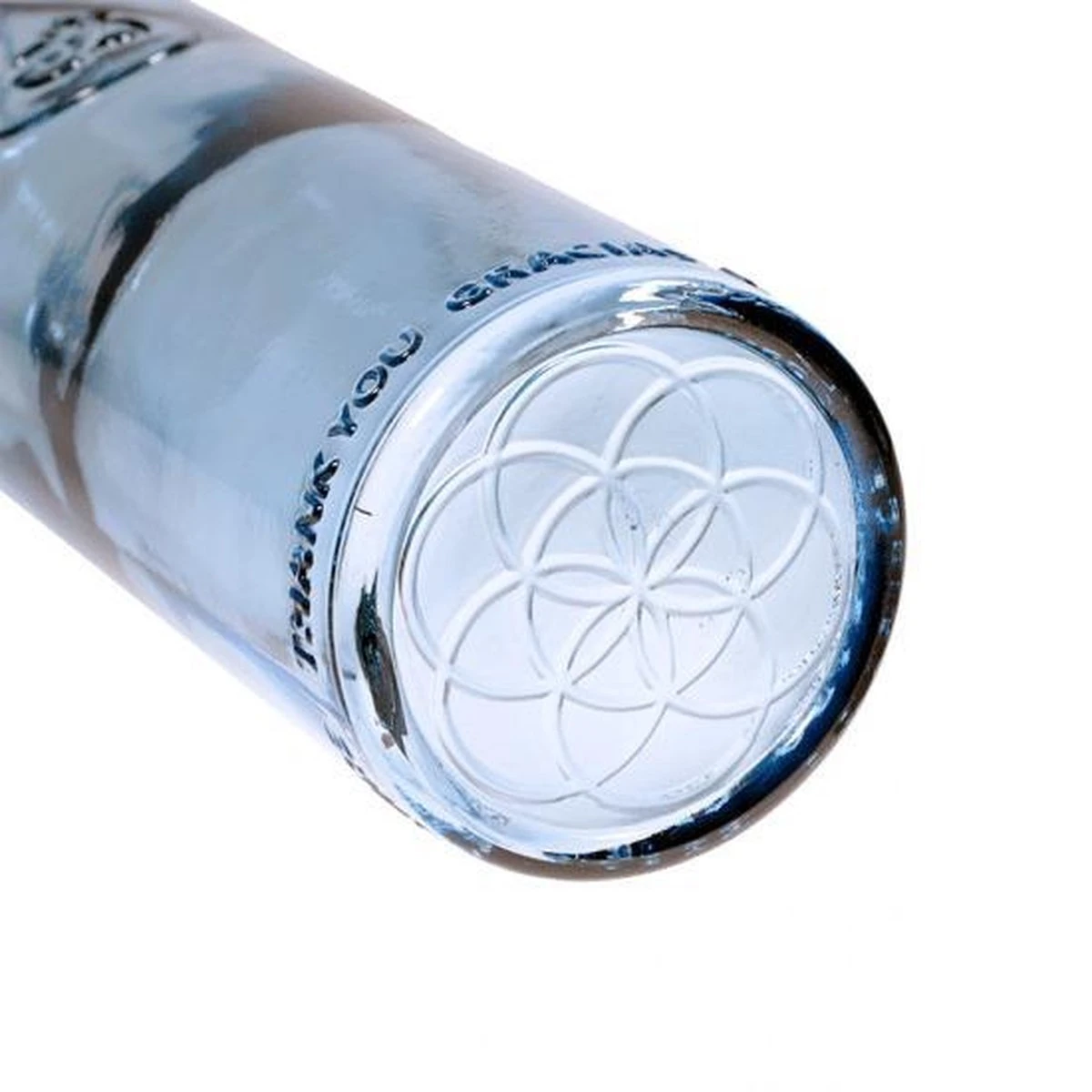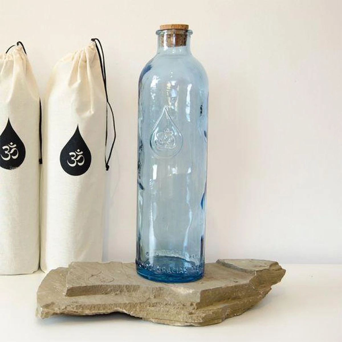 In tasje van 100% biologische katoen OmWater Flessen De Gulden Snede (Moeder Natuur’s mathematische structuur), het OM symbool (Oerklank), de blauwe kleur om het water te solariseren en het Seed of Life symbool op de bodem van de fles vergroten gezamenlijk de positieve trilling van het water in deze fles. En dus ook van diegenen die het water uit deze fles drinken! Natuurlijk behandelde ecologische kurk: Water moet ademen en dus hebben we gekozen voor een kurken stop op deze fles. De kurk is op aseptische manier behandeld waardoor hij zuiver is en geen geur of smaak af geeft aan het water. 100% gerecycled glas, 0% zware metalen: Deze fles hoopt er aan bij te dragen dat er meer (kraan)water gedronken wordt en er minder plastic flessen gebruikt gaan worden. Tasje van 100% biologische katoen: De OmWater Fles Dankbaarheid wordt in een tasje van biologisch katoen geleverd en in Spanje geproduceerd.