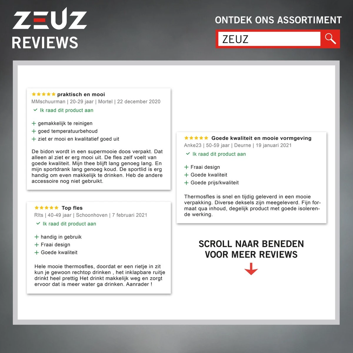 Bij ZEUZ® gaan we voor de beste kwaliteit met een tevredenheidsgarantie van 100%. De thermosfles is gemaakt om te voldoen aan de hoogste normen van kwaliteit zodat jij kunt genieten van de lekkerste drankjes! Heb je nog vragen? Neem gerust contact met ons op via bol.com en we helpen je graag verder.